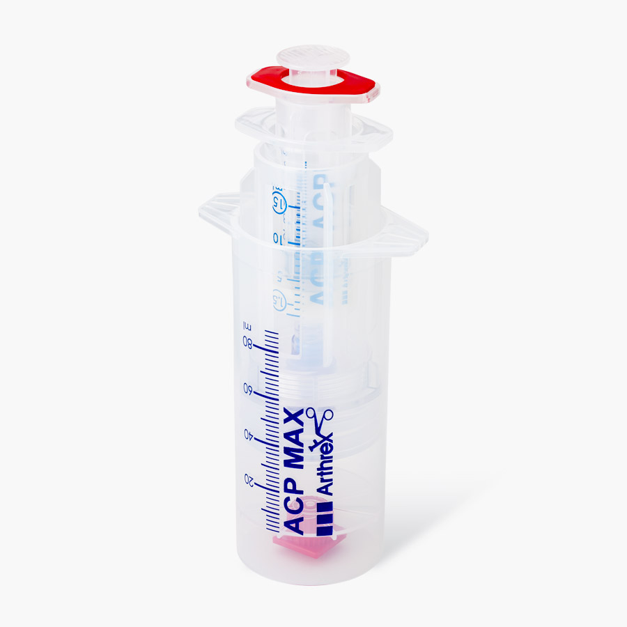 Le système PRP ACP (Plasma autologue conditionné) Max est composé d’un grand corps de seringue, de 2 seringues de 30 ml et du système de double seringue Arthrex ACP®. Le système PRP ACP Max™ a été conçu spécifiquement pour fonctionner avec le système de double seringue Arthrex ACP où est produit le plasma enrichi en plaquettes. Pour préparer le PRP, un échantillon de sang du patient peut être combiné avec une solution anticoagulante de citrate dextrose A (ACD-A) pour prévenir la coagulation pendant le traitement. Le système PRP ACP Max a été conçu pour être utilisé exclusivement par des médecins possédant des centrifugeuses équipées de rotors pivotants pouvant recevoir le dispositif ACP Max. Ce dispositif est fourni stérile, il doit être conservé dans son emballage d’origine non ouvert, à l’abri de l’humidité.